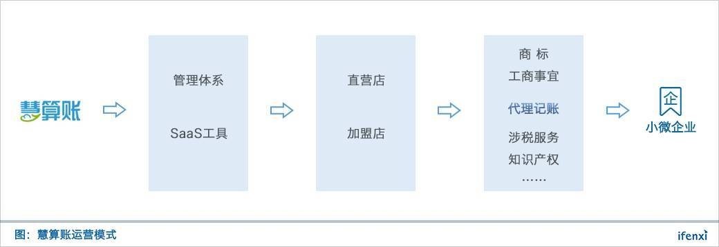 慧算账的商业模式以 SaaS 工具 + 门店服务为主,体现在市场上就是 “直营店 + 加盟店” 的形式。这种模式带来的好处是,在盈利方式上,慧算账并不单纯依靠提供 SaaS 服务获利,向加盟店输出管理方式、帮助其获客,并从其客户中抽取一定佣金也是慧算账的收入来源之一。