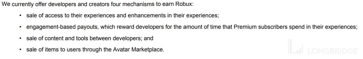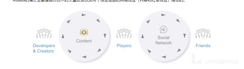 开发者和创作者运用公司平台以及公司提供的引擎和工具持续不断地创造内容,公司称其为 Experiences,然后玩家们上平台游玩,并且与其他玩家建立基于平台的社交关系。