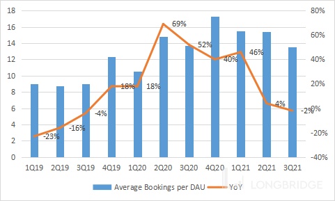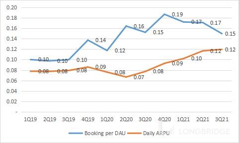 营业收入和 Bookings 主要由 DAU 的增长来贡献,伴随新增用户增加,公司的 Average bookings per DAU 连续两个季度放缓,本季度甚至出现了-2% 的增速,值得重视。