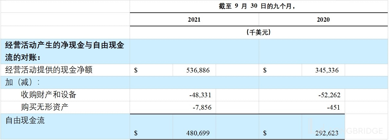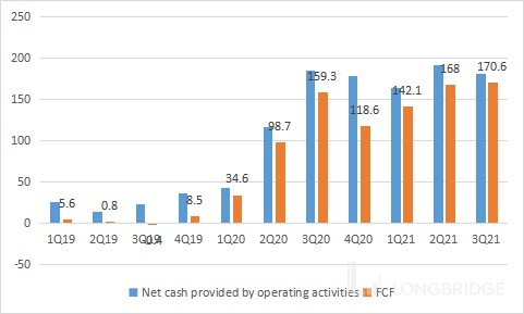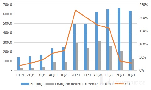 3Q21 的 Bookings 由 3Q20 的 496.5 百万美元增长了 28% 至 637.8 百万美元,Bookings 增速创了近十个季度新低 。Bookings 是未来营业收入的保证,也是公司能够保持正向现金流的重要前提。