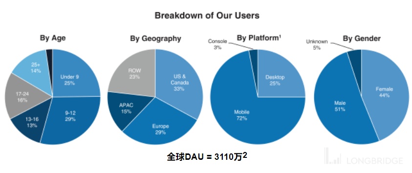 招股书显示,北美地区用户占比为 33%,亚洲用户为 15%。每个用户的 DAU 的预定量为 39.9 美金,平均每天每位用户活跃时间为 2.6 小时,每月会体验 20 个不同的游戏。更详细数据参考 Roblox 数据的 Excel。