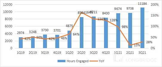 对运营数据进一步的分析,可以看到随着 DAU 的提升,平台整体的玩家时间在提高,由 3Q20 的 87.11 亿小时提升到 3Q21 的 111.84 亿小时。