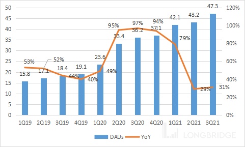 - 平均每日活跃用户 (DAU) 为 4730 万,同比增长 31%:
