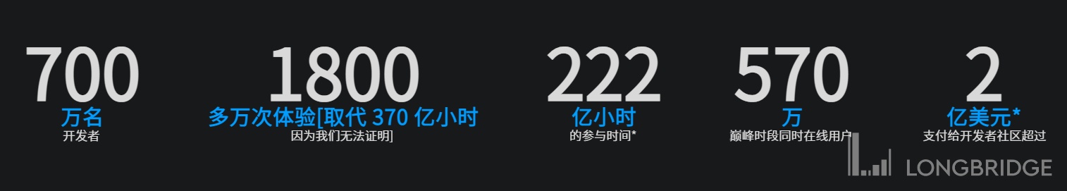 以此,Roblox 搭建了一个开发者通过 Roblox 的工具创造游戏和各类体验,玩家在这个 3D 世界里游玩、社交的虚拟世界。截止 2020 年 9 月 Roblox 共有700 万开发者制作了1800 万个游戏,其中有846 万个被试玩过,有17203个游戏的用户游玩时长超过1 万小时。