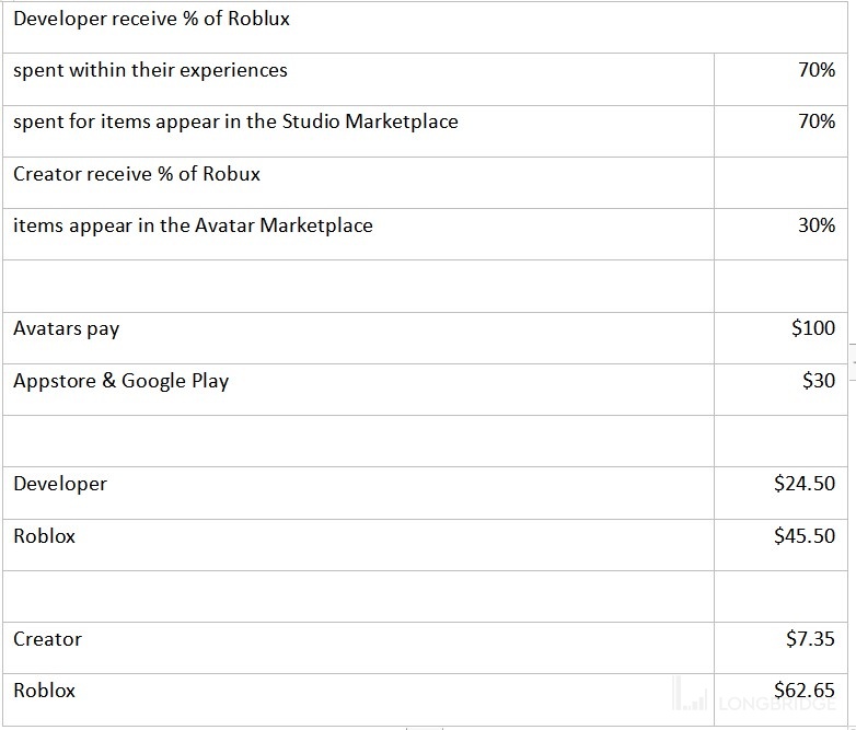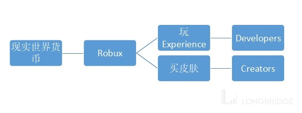 那么资金就有两个流向,首先是玩家通过现实世界货币充值获得 Robux,然后玩游戏支付给开发者,买皮肤支付给创造者。