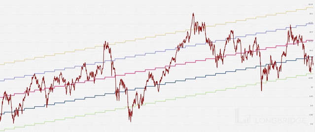 在統計學上,線性回歸分析法是利用過往數據來預測未來趨勢,線性回歸通道可以理解為平衡點,而標準差平衡線可以提供支持或阻力。1 標準差代表 68% 數據在 +/-1 標準差平衡線之内,2 標準差代表 95% 數據在 +/-2 標準差平衡線之内。而我們匯入了十年恆生指數的數據,恆生指數現在非常接近下方綠色的線,即是下跌的 2 個標準差。而跟據十年的數據,恆生指數理論上有 95% 機會在綠色的線之上運行。那表示恆指目前雖不見底,也不遠。