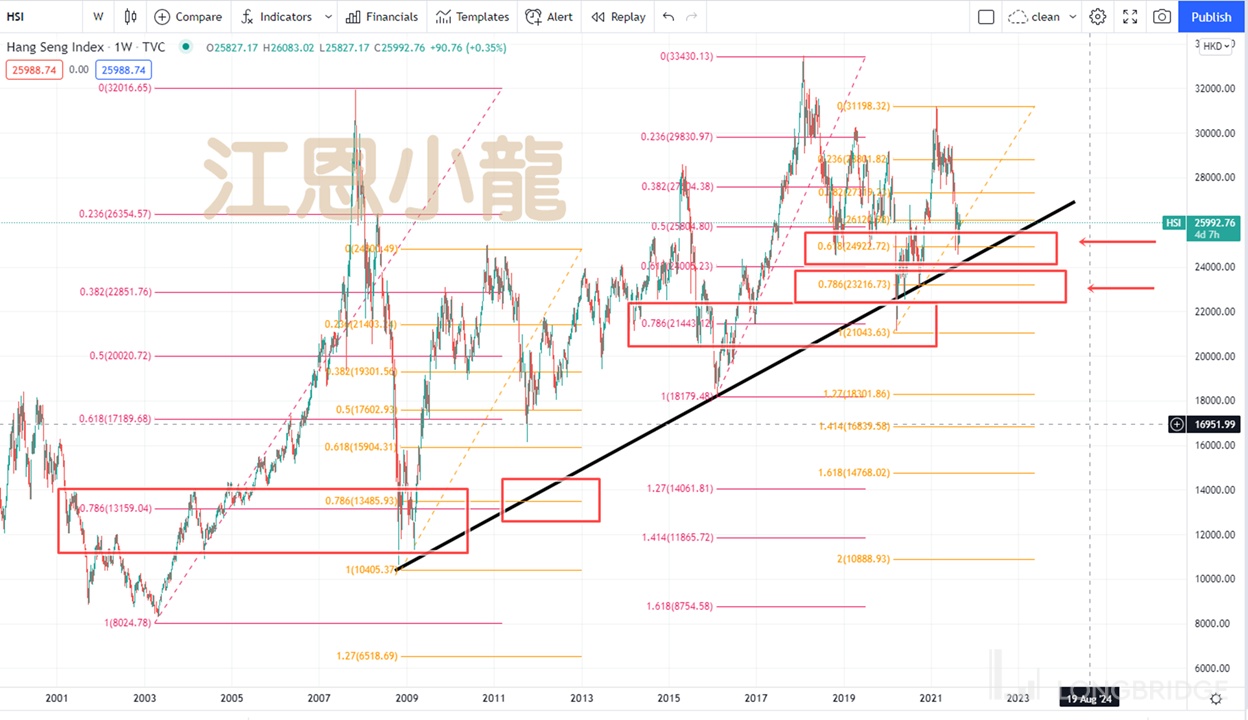 在上圖中,我們見恆生指數過去幾次大跌後,都是挑戰 0.618/0.786 的位置,如上圖。那恆指目前已經挑戰了 0.618,即約 24900 的位置,而 0.786,即是約 23200 點的位置。