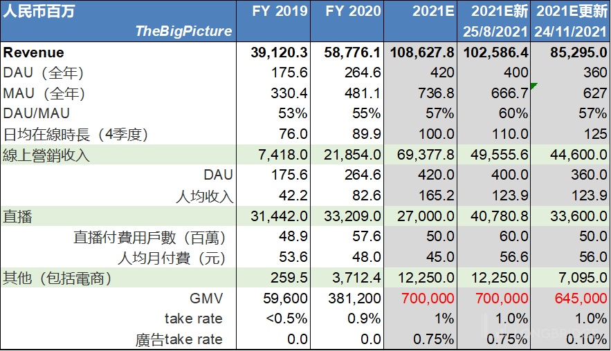 基于以上财务数字和经营数字更新,我将专栏里的一些 2021 年关键假设要素更改如下表: