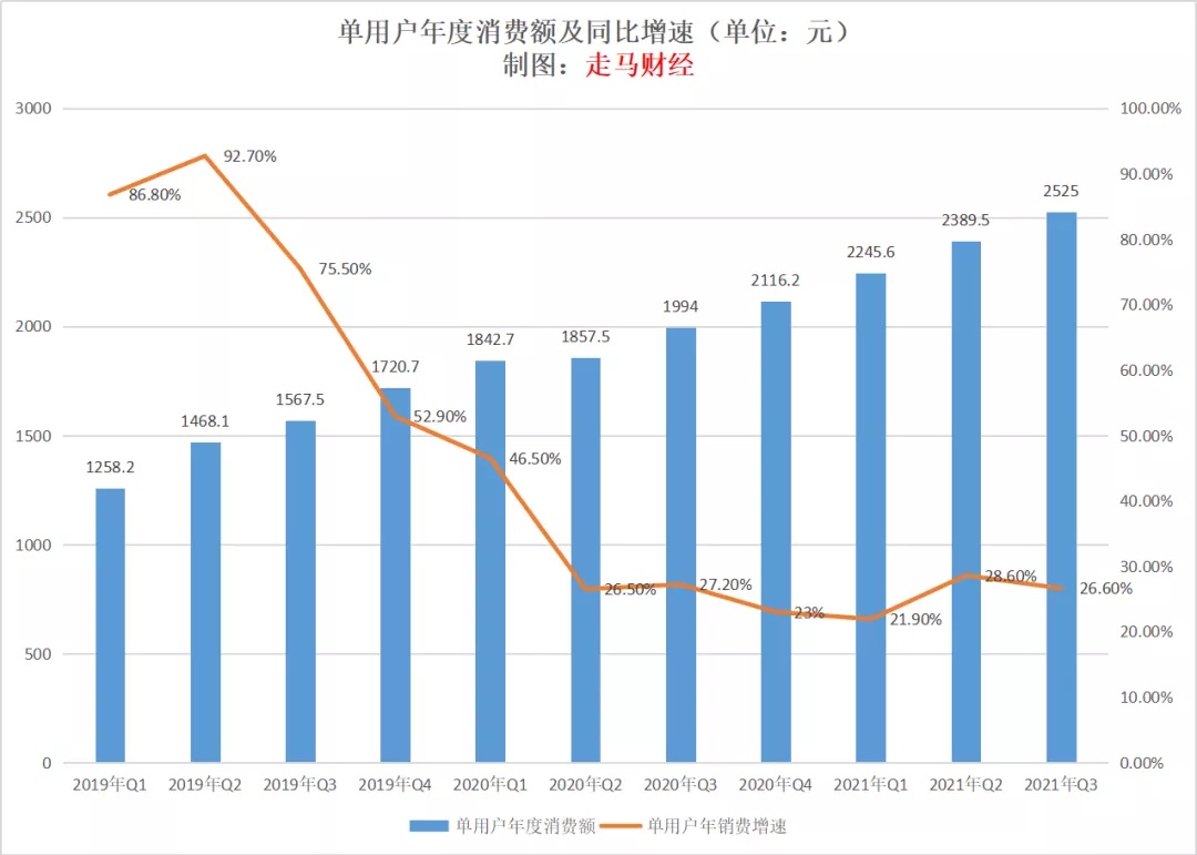 而我们看用户的消费金额增速,2020 年 Q2 以来一直维持在 25% 左右,最近两个季度这一数据也没有放缓的迹象,在笔者看来,只要拼多多年度单用户消费金额增速维持 20% 左右,就是非常不错的趋势,那么市场又有什么好恐慌的呢?