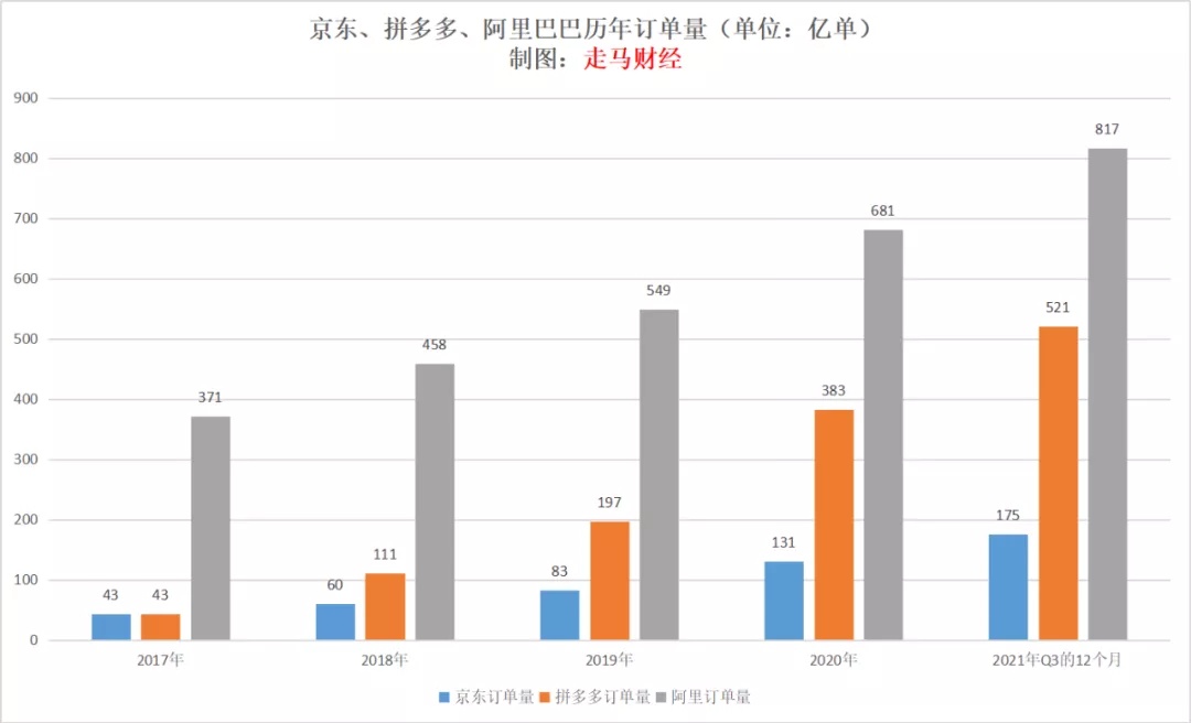 而以订单量计算,拼多多截止 Q3 的 12 个月相对于 2020 年 Q4 的 12 个月仍有大约 36% 的环比增长,到今年 Q4 估计将达到 46% 左右的增长。