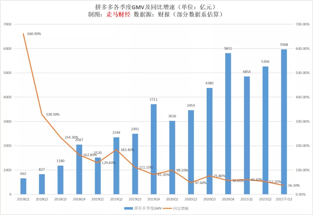 根据笔者独立核算,拼多多 Q3 的 GMV 规模大约 5968 亿元,同比增长 36.3%,是同期网络零售增速的 4.8 倍。