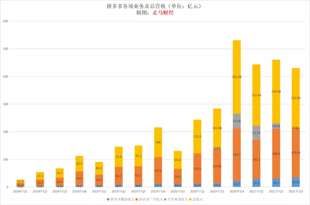 但是,自 2020 年 Q4 开始,拼多多有了自营业务,严格来说,实际上是从 Q3 开始的,只是当时自营只有 3.9 亿元,没有单独披露,算进了广告营销收入里。