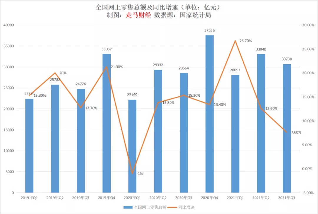 再看看最近 11 个季度全国网上零售总额和他的同比增长情况,三季度的同比增速已经下降到了个位数的 7.6%,前三季度同比增速也仅仅增长 18.5%。