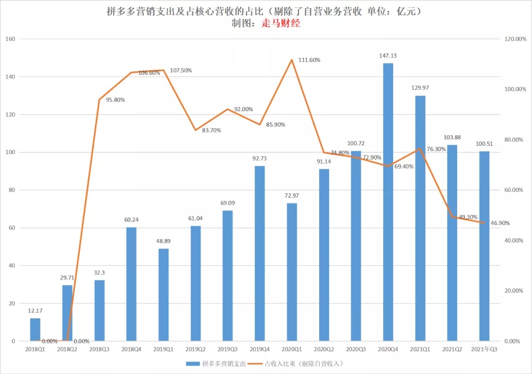 Q3 营销支出 100.51 亿元,同比甚至下降了 0.21%,这是拼多多历史以来首次出现营销支出下降,以前都是同比 100% 甚至更多的增长,环比也下降了 3% 左右。