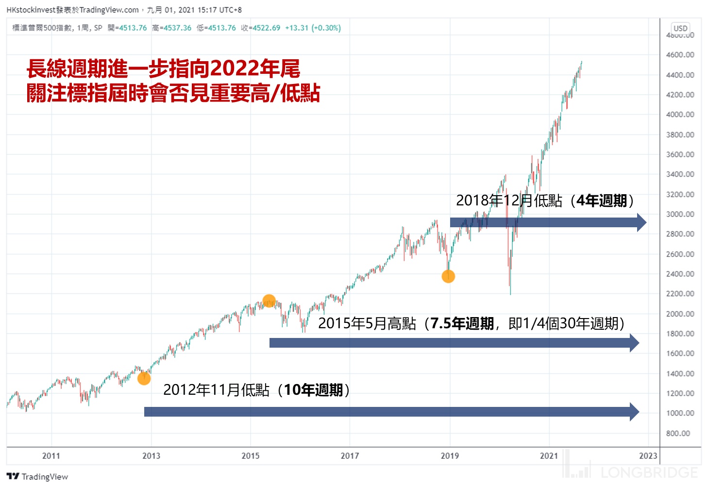筆者 11 月 20 日發表《美股今年走勢像極了 2017 年,明年會難玩如 2018 年嗎?》一文,強調美股標指明年 4 月附近有目標高點時間,而 2022 年尾/2023 年初則可能見重要低點。2022 年尾這時間點,筆者曾在 9 月線上講座提出,本文圖表沿用當時講義。