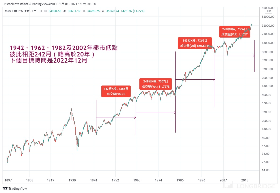 圖二同樣是道指長期月線圖。我們發現圖一所列週期中,有一組 242 月(相當於 20 年)週期重複出現:1942、1962、1982 及 2022 年熊市底之間,相距 242 個月。倘若我們在 2002 年 10 月熊市底加上 242 個月,目標時間正是 2022 年 12 月。