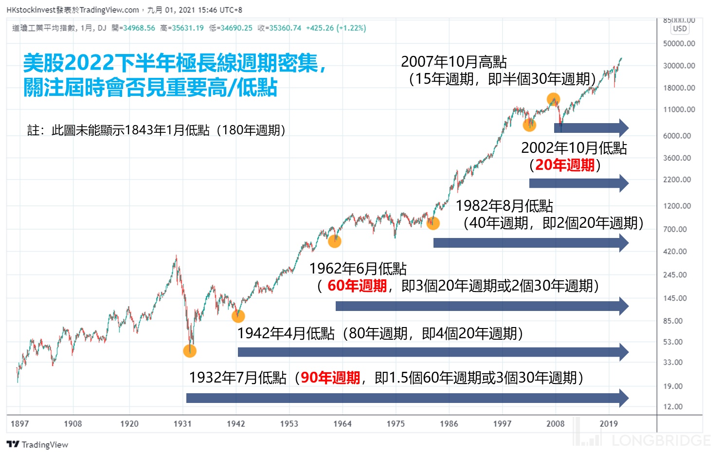 圖一是道指長期月線圖,明確標示 2022 下半年極長線週期密集,而圖中大週期對應的長線轉折點,絕大部份是熊市低點,當中包括 1932 年大蕭條熊市底及 2002 年科網熊市底。