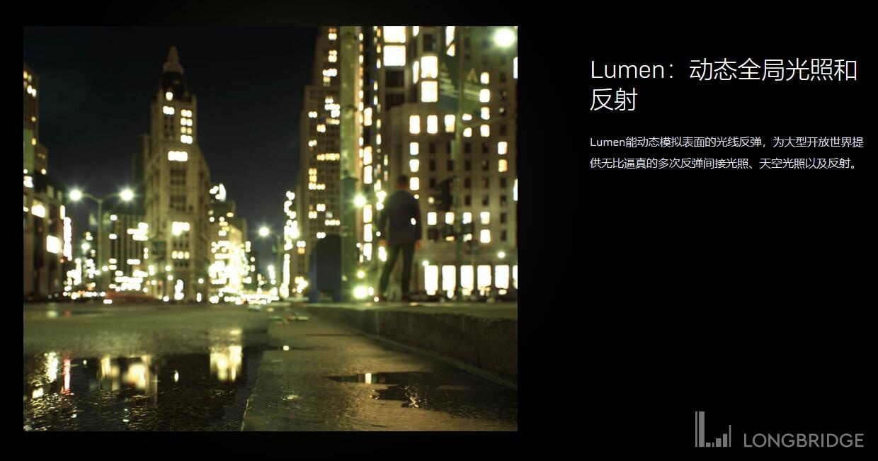 光线方面,Lumen 动态全局光照技术能将 NVIDIA RTX 的光追效果发挥到极致,以往游戏城市建筑中的内透现在可以被完美被展现出来了,若地上有积水效果,那么夜间光照的渲染将更加绚烂。再次提醒,以上图片都是虚幻引擎 5 制作的画面,而非照片。
