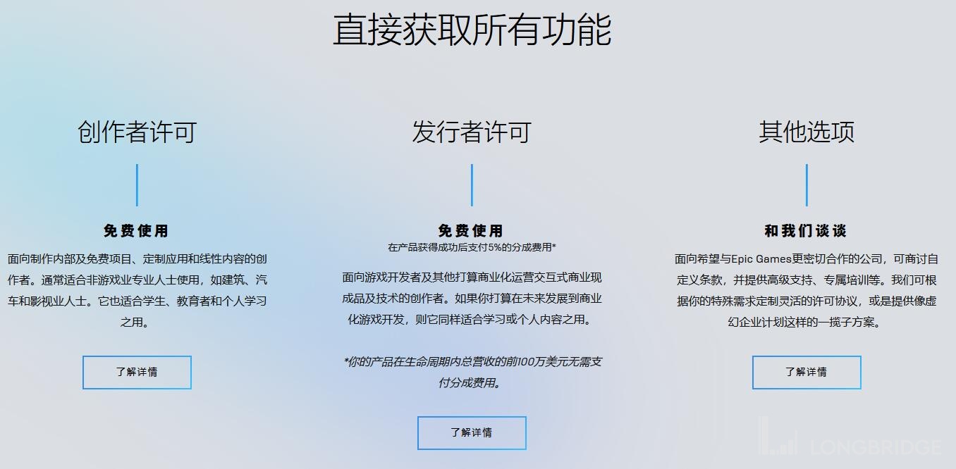 除了对学习开发者采取免费政策外,虚幻引擎在订阅费的收取上和 Unity 存在很大差别,Epic 直接将所有商用开发项目都统一按抽成 5% 获利,但前 100 万美元内不用付费,这也反映出虚幻引擎的目标客户主要是 3A 制作,毕竟大项目抽成的收入可比 Unity 按人头收爽多了。假如还需要引擎定制服务的话,那就只能 “价格面议” 了。