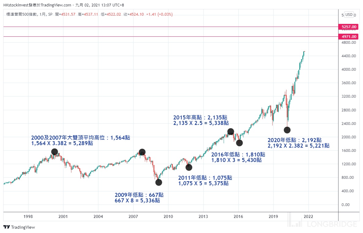 下圖是標指月線圖,取自 9 月線上講座講義,兩條粉紅橫線分別標指兩個九方圖阻力位 4,971 點及 5,257 點。筆者的標指中線價格目標至今沒有改變:4,971 點接近五千點,是筆者的保守目標;5,257 點則位處長線黃金比率密集阻力區五千三百點附近,可視為樂觀目標。五千三區域黃金比率密集,例如它相當於千禧年代大雙頂的 3.382 倍、2020 年低位的 2.382 倍及 2015 年高位的 2.5 倍等。