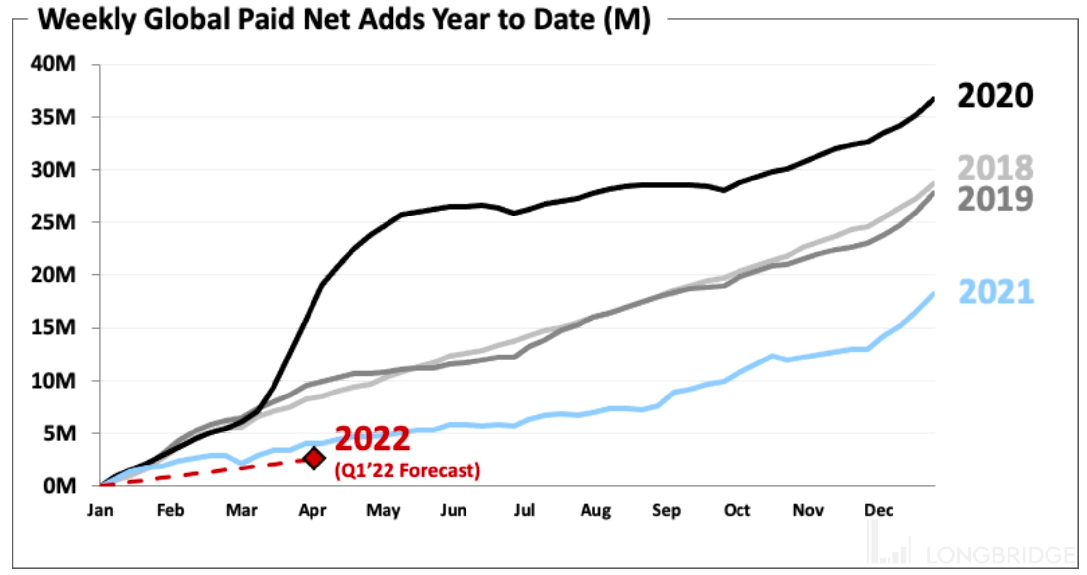 四季度全球用户净增 828 万,低于此前指引的 850 万。这一点,在一个月前,基于剧目实际播出效果,华尔街们已经纷纷下调预期,也反应在持续走低的股价中。但这次的惊天暴雷则是对 2022 年 1 季度的用户增长指引 250 万,大幅低于市场预期的 450-600 万。