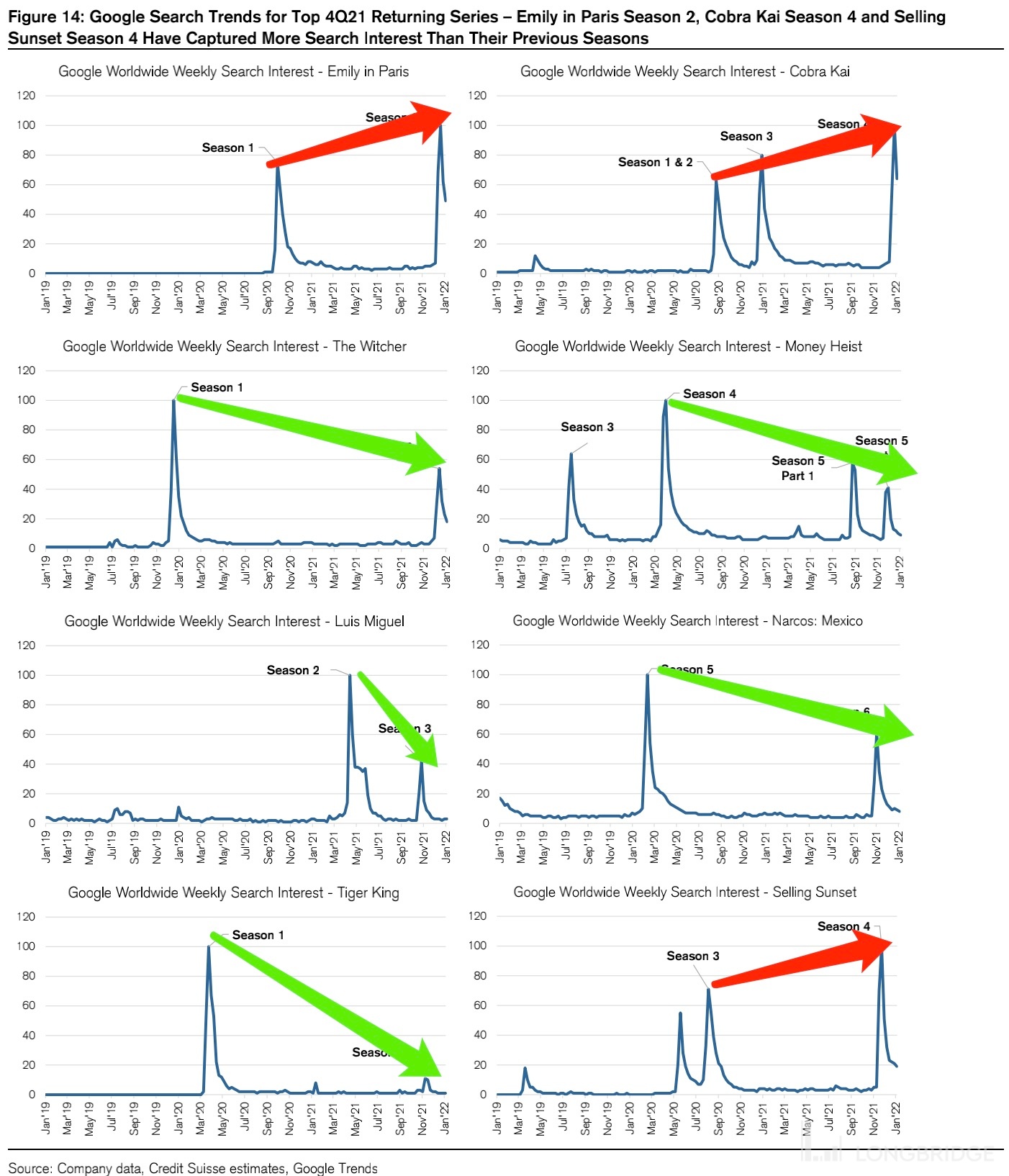四季度是奈飞的内容供给是公认的丰富,不少优质系列剧出续集。但从实际反响(google 搜索指数)来看,虽然这些剧集明显领跑同行,但不少系列剧续集的热度不及前部。其中《Tiger King》第二季、《The Witcher》第二季表现都意外差,号称奈飞成本最贵的电影《Red Notice》反响平平,《Emily in Paries》第二季和《Cobra kai》第四季热度相对较高。