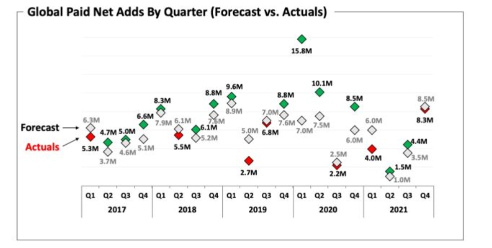 2022 年 1 月 21 日,全球流媒体巨头发布了 2021 年 Q4 的业绩,业绩里的 Q4 新增用户 Miss 了预期,同时对于 22 年 Q1 的新增用户展望也大幅度不及市场预期。同时经营利润率等无法按照公司原定计划稳步提升。最终结果触目惊心,盘后跌幅达到了 20%。
