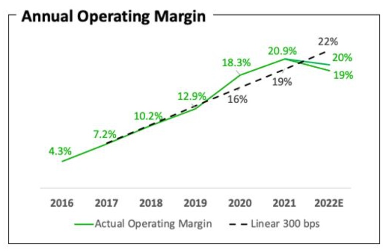 新增用户数量决定了公司的收入,上文我们分析来看是不及市场预期的。那么在成本端则因为内容成本摊销提升而没有带来相应的收入导致成本端压力增大。因此从公司给到的指引来看,公司预计 2022 年的经营利润率无法实现此前高喊的年增长 3% 至 22%,而是调低预期到 19-20%。
