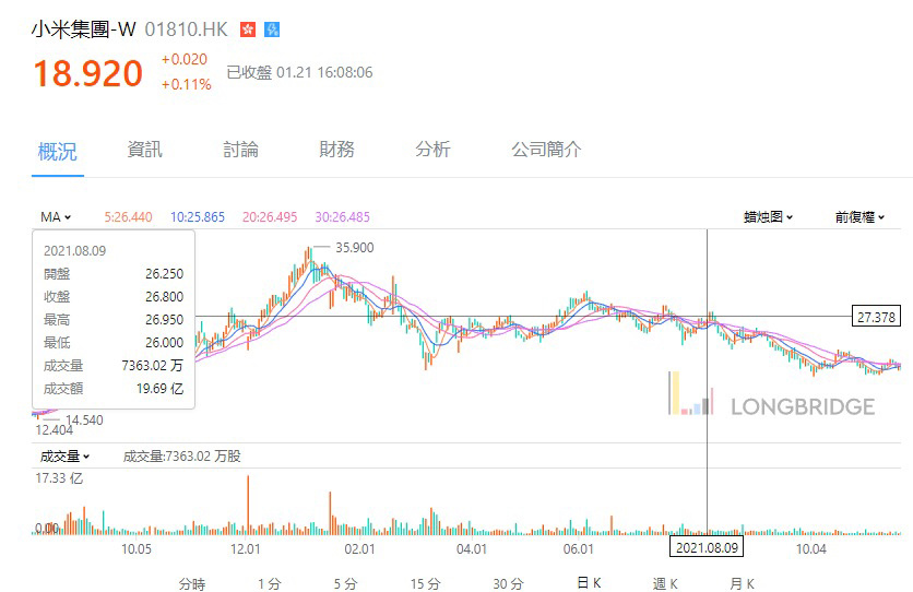 以$XIAOMI-W(01810.HK) 為例,股價於 2021-8-9 再次向上挑戰 27.3,遇上重要阻力後,突破失敗,便一直向下尋底