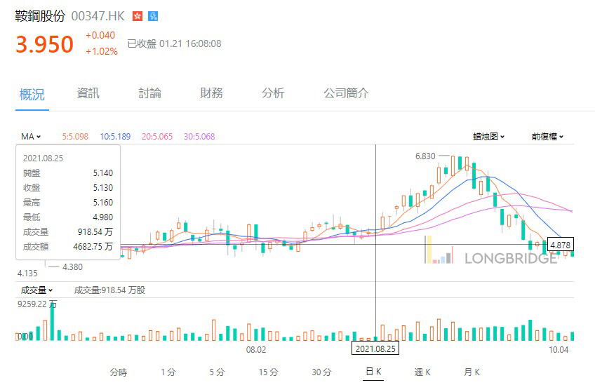 $ANGANG STEEL(00347.HK) 為例,在收集區時,股價上升時伴隨成交量上升,下跌時伴隨成交量萎縮,之後股價出現極急的突破性發展