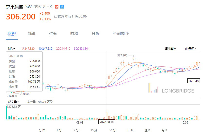 以$JD-SW(09618.HK) 為例,當股價於 2020 年 8 月 18 日第一次出現大裂口大成交突破,股價短時間內一飛沖天