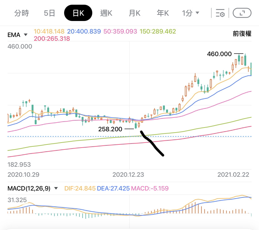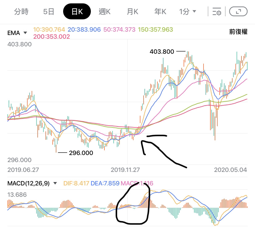 以$TENCENT(00700.HK) 為例,當 MACD 以及 EMA 皆出現明確訊號,股價飛升。MACD 出現交叉向上升穿零,MACD 柱亦是;而 EMA 匯聚後出現向上,形成多頭排列
