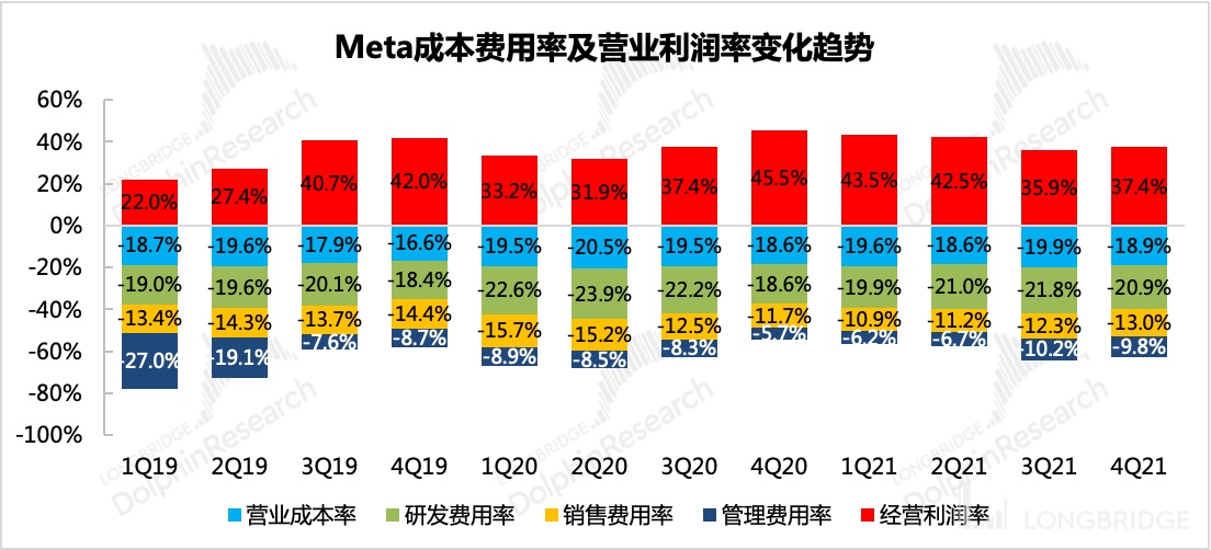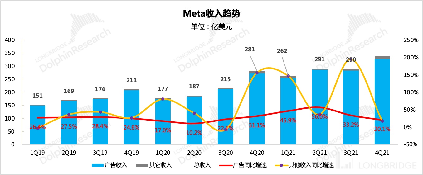四季度 Meta 实现广告收入 326 亿美元,同比增长 20%。剔除意外超指引的其他收入(10.3 亿)后,广告收入表现很一般。虽然华尔街以及一些广告主对 Meta 应对苹果 iOS 隐私政策的效果期待较高,但从结果来看,Meta 还需要时间去修复。