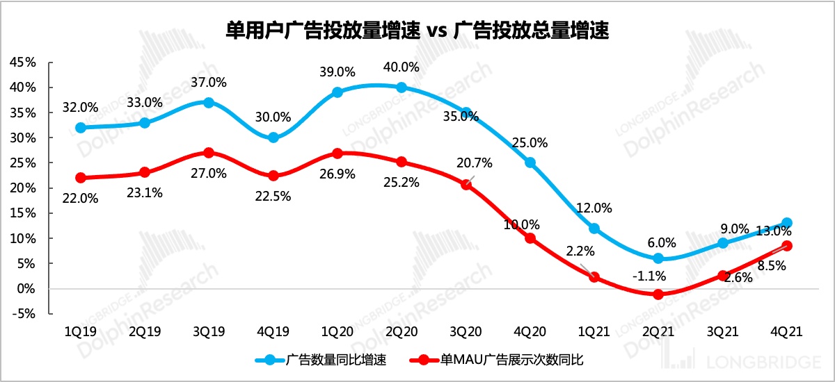 四季度单用户广告投放量同比增长 8.5%,在流量增长遇到瓶颈时,广告总量开始靠填充广告位来实现增长。
