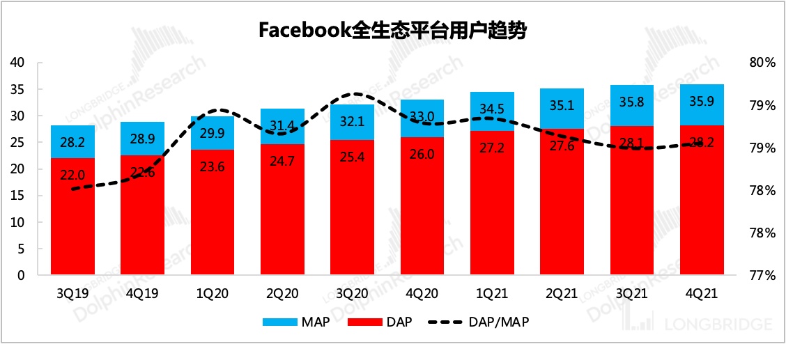 2)用户规模:增长几近停滞,全系列 App 全球环比净增 1000 万,核心 Facebook 只增加了 100 万,与以往比断崖明显。如何获取更多的年轻用户是一直让 Meta 头疼的问题。