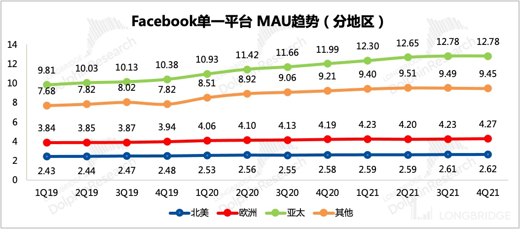 四季度 Facebook 单一平台用户增长几乎停滞,原先大步向前的亚太地区,竟然接近零增长。Meta 生态系的其他 app 在四季度用户增长也非常惨淡,从三季度的 5400 万陡降至 900 万。