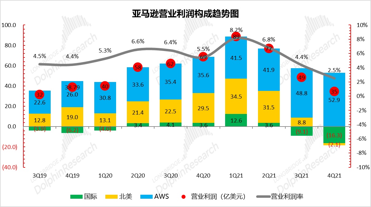 - AWS 业务的利润释放则依旧亮眼,本季度营业利润高达 52.9 亿,营业利润率达 29.8%,在高位小幅波动。