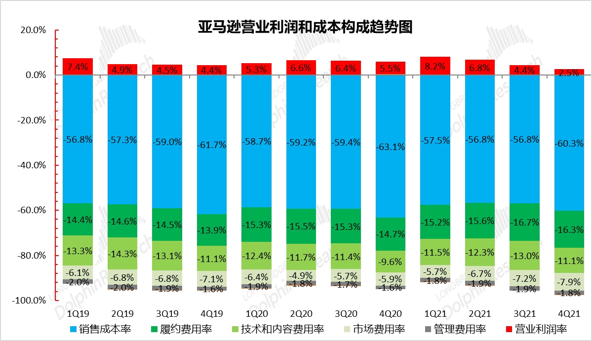 - 利润角度,本季营业利润达 34.6 亿美元,利润率为 2.5% 远超指引 0-30 亿的上限和市场预期。究其原因,除了强劲的 AWS 云服务外,公司零售业务的亏损也小于预期。从成本和费用的角度,本季的成本率仅为 60.3%,远低于 20 和 19 年同期的水平,是超预期的主要原因。但三费受通胀影响,其恶化也在预料之中。