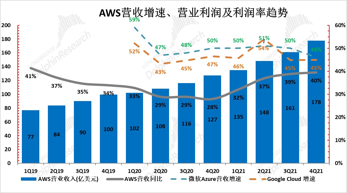 作为公司真正 “赚钱” 的业务,AWS 云服务本季营收 178 亿美元,同比增长 40%,营收增速在 2021 年连续 4 个季度持续提升。横向来看,虽然微软 Azure 及 Google Cloud 等 “跟随者” 的营收增速更高,但考虑到亚马逊 AWS 的体量远超其竞争者,从云服务营收净增额的角度,亚马逊仍远远领先其竞争者。因此,从营收绝对值的角度,亚马逊与其竞争者的差距仍在拉大而非缩小。