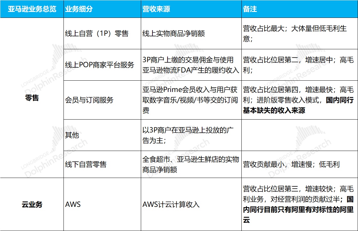 从收入结构来看,亚马逊的业务主要分为零售相关业务和云相关业务两大类。其中零售大类可细分为线上自营、线上 3P 卖家服务(佣金与履约费)、线上广告、会员与订阅服务,及线下自营。