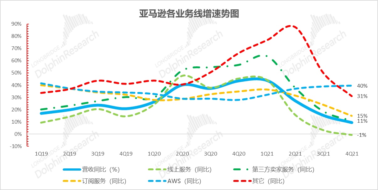 四季度公司总营收 1374 亿美元,基本复合市场 1379 亿的预期,同比增长 9%。总的来说,公司营收增长仍在减速,但考虑到亚马逊往年通常在 7 月举行的大促 Prime Day(类似与国内双十一)在 20 年被延期到 4Q 所导致的高基数,和消费边际回流线下的大环境。营收增速下滑已在预期之中,本季落于 1300-1400 亿指引上半的表现可算中规中矩。