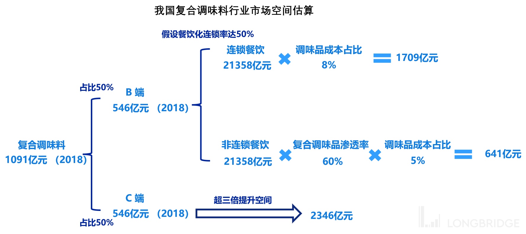 海豚君认为 B 端方面餐饮连锁化率提升带来复合调味料需求,同时复合调味料在非连锁餐饮的渗透率有望提升,C 端主要受国内人均复合调味料支出带动,中性预计我国的复合调味料市场空间约为 4696 亿元。