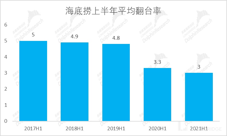 今 2021 年上半年,海底捞门店的整体翻台率仅为 3,反观 2017H1 至 2019H1 三年,这项数据在 4.9 左右,降幅明显,较 2020 年上半年数据降幅明显,也有一定程度的下滑。