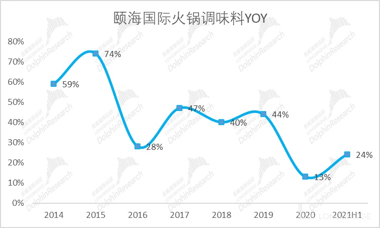 海豚君对颐海国际关联方、经销商、电商渠道上增速做了梳理,除去 2021 年上半年,2017~2020 年经销商增速均大于关联方收入增速,这其实也并不难理解——即使消费者去线下火锅店用餐未必有那么大的粘性,但是消费者对于火锅的需求仍在。