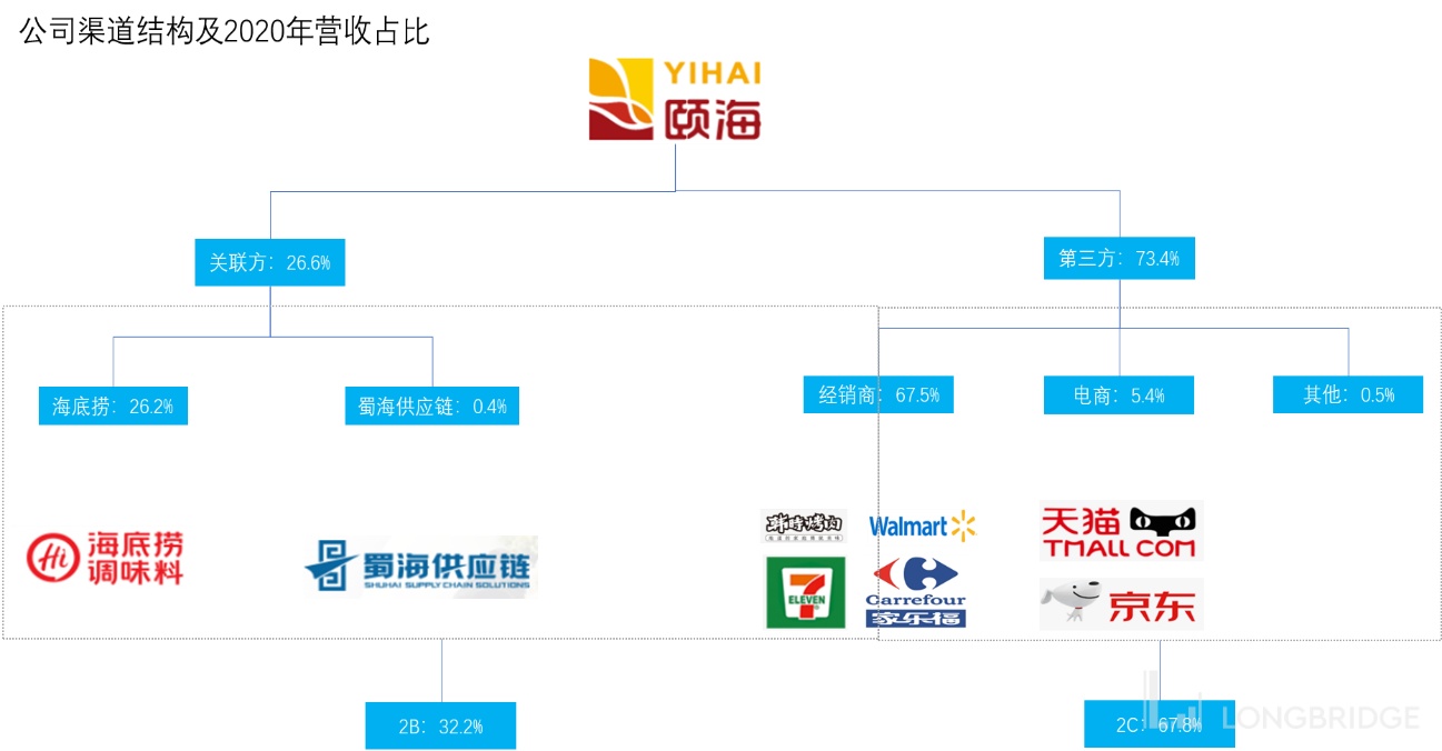 分为 B、C 端看,2020 年颐海国际 B 端及 C 端占比分别约为 32%、68%,对海底捞的依赖度逐步下降,公司开始更注重 C 端竞争优势的强化。