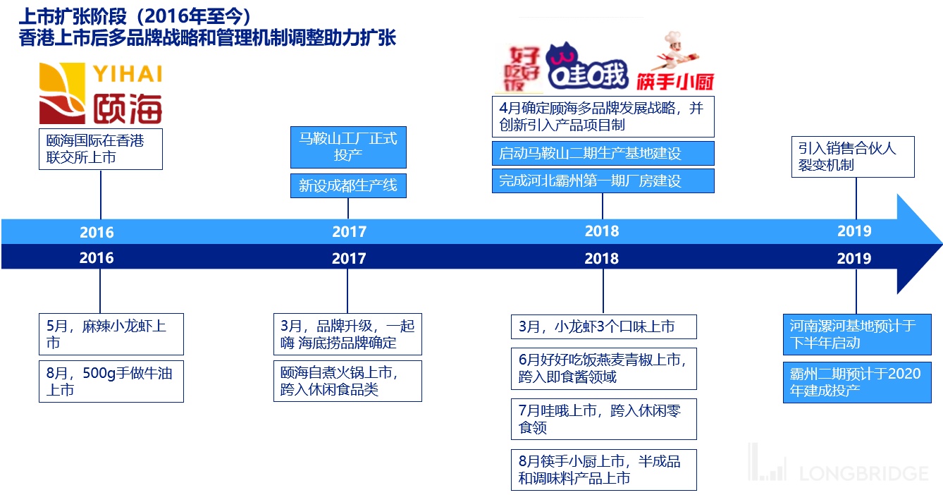 上市后,公司确立多品牌发展战略跨入新领域,管理机制调整为快速扩张提供保障。2016 年 7 月 13 日,公司在港交所上市。同年,公司麻辣小龙虾和 500g 手做牛油等新产品上市,产品线日益丰富。