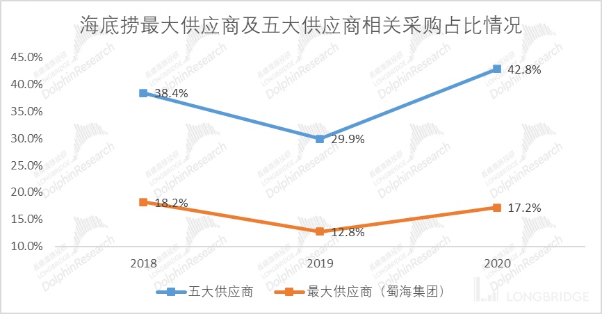值得注意的是在海底捞年报中,海底捞披露了最大关联公司蜀海的交易额。2018 年、2019 年、2020 年,该项年交易金额分别为 18.60 亿元、22.22 亿元、27.40 亿元。