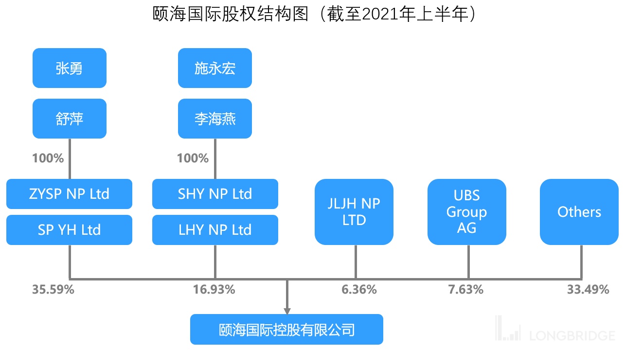 公司股权结构集中,实际控制人为海底捞创始人。截至 2021 年上半年,非执行董事张