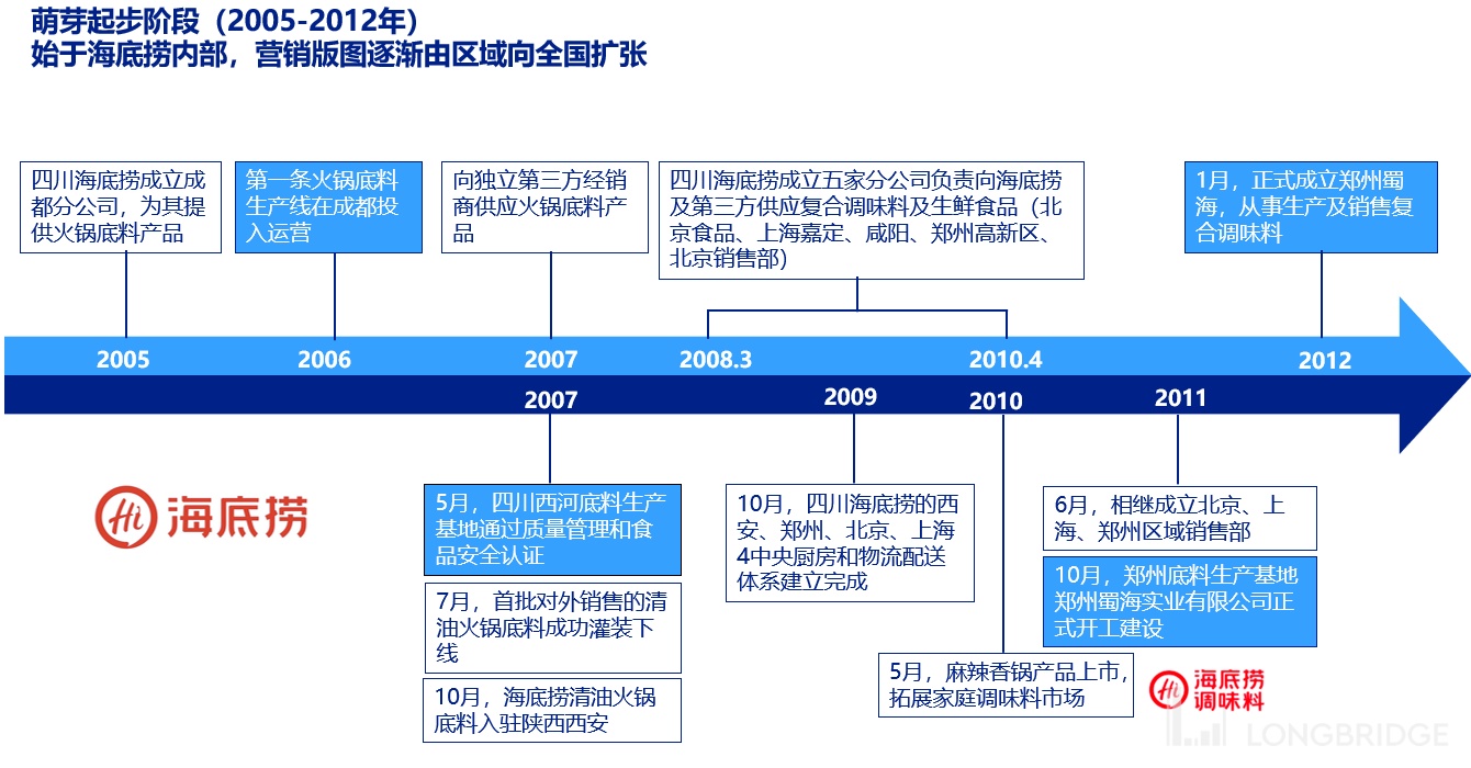 (1)萌芽起步阶段(2005-2012 年):始于海底捞内部,营销版图由区域迈向全国