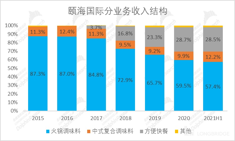 得益于自热方便食品的成功,从 2017 年开始,由海底捞所贡献的营收比例开始逐渐降低,到 2020 年,这一比例已经下降至 26.5%。